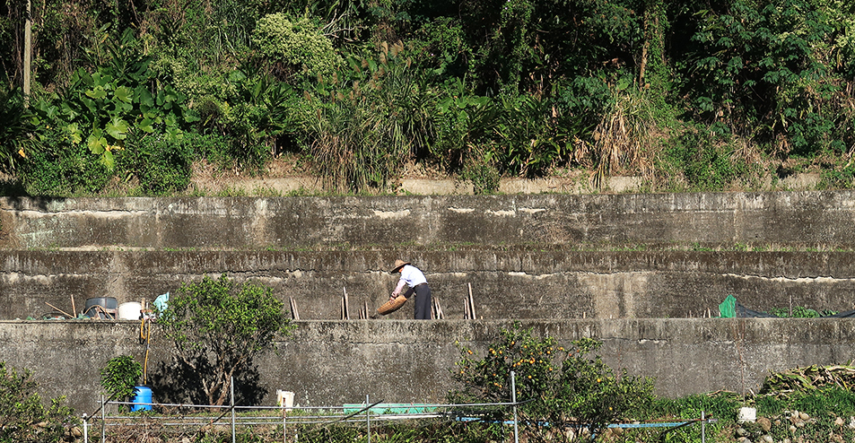 The older retaining walls are made from large round stones - pebbles bigger than your head - and this whole area must have been under a glacier during the Ice Age. A few minutes later, when I take a photo of a second farmer at work, an older guy wearing a conical straw hat, I notice the walls are concrete and lack rustic charm. Concrete is the go-to material in Taiwan.
