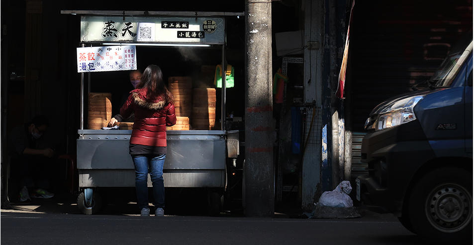 It turns out this is maybe an hour or so too early, as the wall is in shade, so I make my way towards Louisa Coffee, cruising along back streets and alleys on the lookout for anything photogenic. There's not that much, but I spot a dumpling stand stacked with the round containers they get steamed in and make do with snapping one of that.