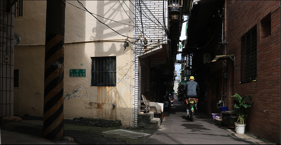 I make my way back to the wall and take a snap, but the sun has gone behind clouds now and it all looks a bit flat, so I ride a block east then start cycling north towards the train station in Taoyuan.