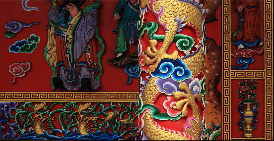 We cross Route 112 and ride to the small river and head downstream towards the ring road, but I soon stop at a temple as the paintwork looks fresh and vibrant, and I take a snap of a column typically decorated with a dragon and stylized clouds.