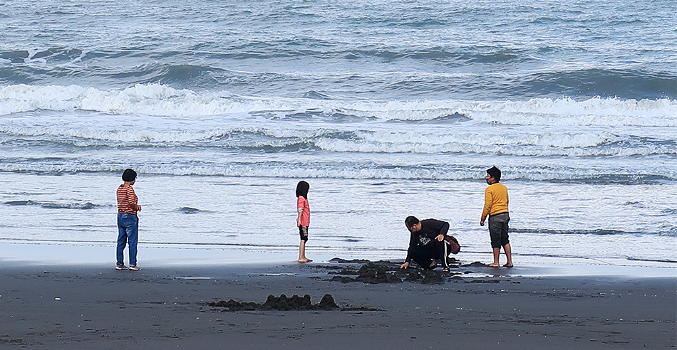 While there are a few people on the grey, damp sand, nobody is swimming. I'm not sure how cold the sea is, but its steely tone doesn't look very inviting. A family of four is close to the water's edge and Dad is busy with a spade, while the two children and their mother seem to have their own agenda and simply watch on or gaze at the distance.