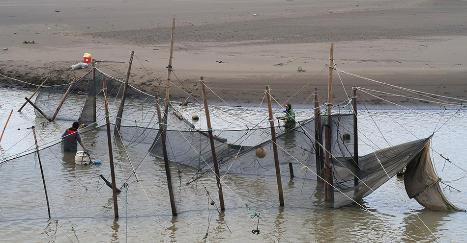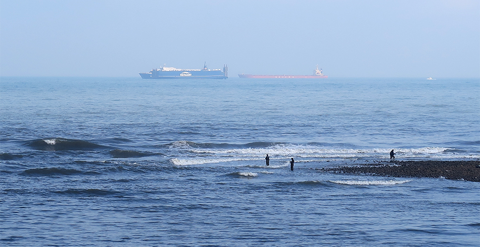 It's a gentle climb to its apex, which gives us a view of the open sea on our right, with some fishermen stood in low waves that are lapping onto a bar of rock-strewn shoreline. A couple of freighters are far out to sea and a subtle haze is diffusing their features. We cruise down and immediately enter the fishing port of Zhuwei.