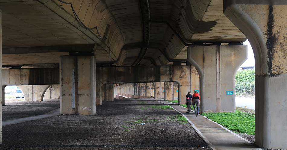 Unfortunately the path ends and we have to ride on the lower section of the road, with the main one with fast traffic being elevated. Cars and container trucks still zip by and it's a lousy ride for quite a while. A gentle wind is at our backs and we get close to the airport and see signs for Guanyin, a small town which has places for lunch.