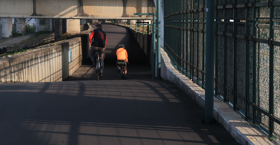 A couple of blocks away is the bike path and g guides us there. I've cycled along some of it with him before, but not west to the coast. There'll be a bit of novelty.