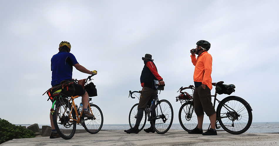 There's a Hi-Life store where we get cappuccinos and the cups go in our bottle cages and we ride over to a nearby pier where we can sit and take in the view of a long, mostly empty beach.