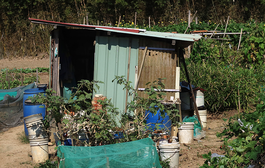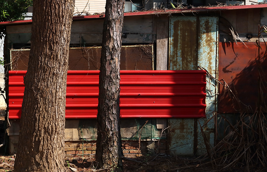 The first shed I see is almost new and lacks character, but soon after I see one that's comprised of various types of sheet metal. Looking at the display on my camera, it's hard to say if these photos will work.