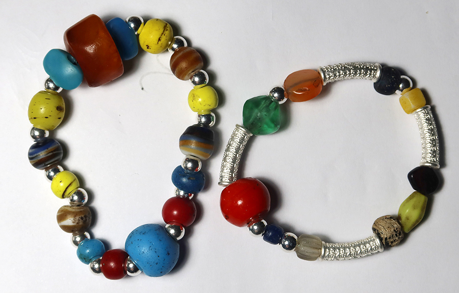The man kindly helps thread a bracelet together, alternating silver with the old beads - then, as I have some left, I decide to make a second one, incorporating some long, tubular beads that are slightly curved and textured. It takes about 30 minutes and I wonder if this is usual business. It's anyone's guess.
