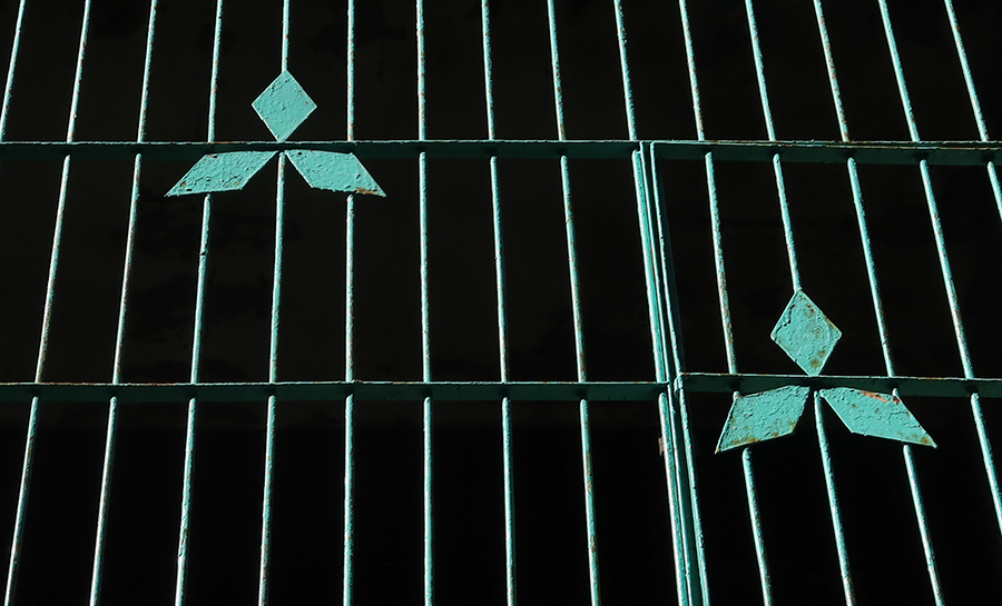 Sliding doors the full width of the ground floor of the tall houses are nearly all the original wooden ones, which is unusual, as they've usually been replaced with alloy ones. They are painted the same deep brown, which isn't very photogenic in the shade, so instead I take a snap of a window grill on an upper floor that has Mitsubishi-like emblems welded on it. It's in bright sunshine and painted turquoise - my fave colour.