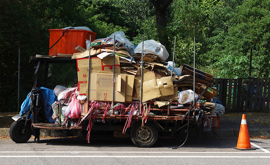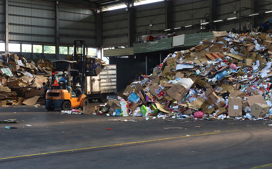 The are a few eldely people pushing trolleys loadedwith recyclables and the yard has a mountain of cardboard that a forklift truck fitted with a shovel is working on moving around.