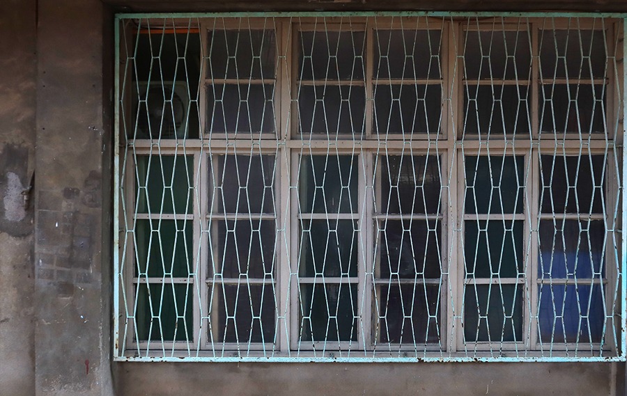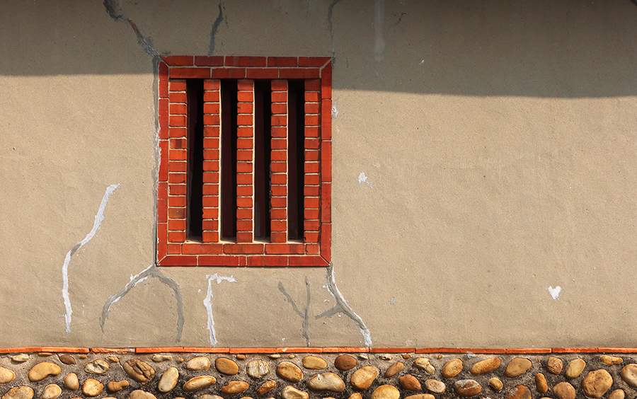 It's not clear if anyone now lives in the place as it has that abandoned look to it. I walk into the front yards and take a photo of one of its windows - formed with columns of single bricks.