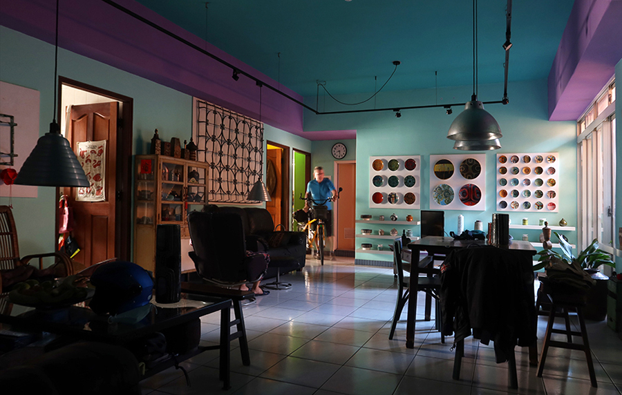 About 20 minutes of chat later, we're back in the sun and after going under a flyover to cycle west, it's an urban artery that's lined with all kinds of shops and new, 20-storey apartment blocks that make it feel we're in a canyon. A handful of small fluffy clouds have materised and hang around above.