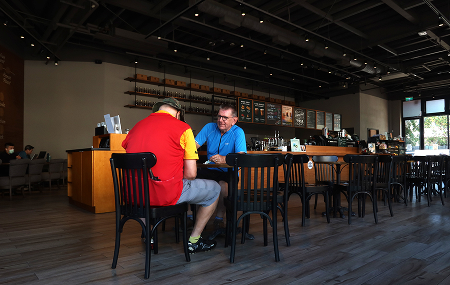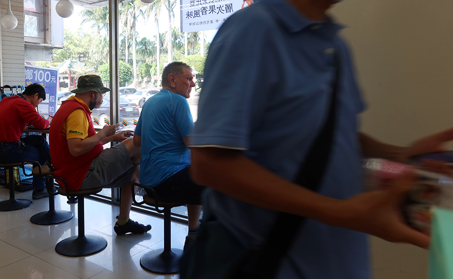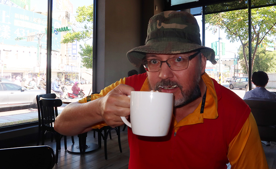 It's only a few minutes before we're riding beside rice fields that look about ready to harvest, with the odd metal-clad industrial unit here and there. The path lasts for quite a while and we cross a couple of small roads before getting to a district called Yangmei and are spat onto urban streets. Ten minutes later we're in a roomy Starbucks that looks like it could comfortably seat 100 or more and Ralph orders a pumpkin spice latte. Mine's a grande cappuchinno with a cinnamon roll as a sugar rush appeals.