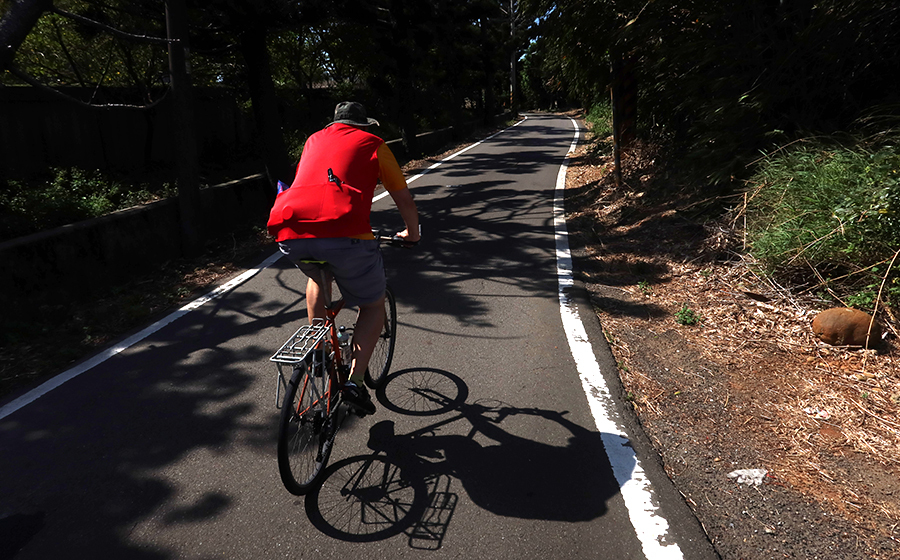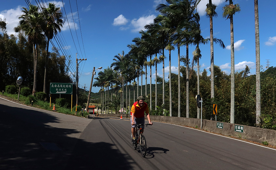 At one spot we pause for a drink and a pixelboard display reads 10:57, then switches to 30 degrees. There's a few kilometres of spinning away with bamboo and shrubs hemming us in. Pine cones litter the road surface as we get higher and signs say we're still on the 11. After the crest, the lane eventually drops us at high speed onto a wide road.