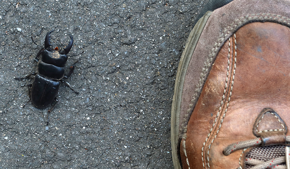 There's a steep, bendy climb to get up to the town of Bade and my shirt and mitts are sweaty and it's good to have an excuse to stop and wipe my face with a pub towel when I spot a beatle on the tarmac. It's a biggie with a pair of nasty-looking pincers opened out. I take a snap.