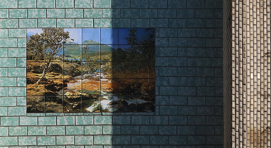 The sun is on a tiled wall I spotted a while ago and I take a snap of it. My guess it was done in the 1970s. The image looks like Scotland to me.