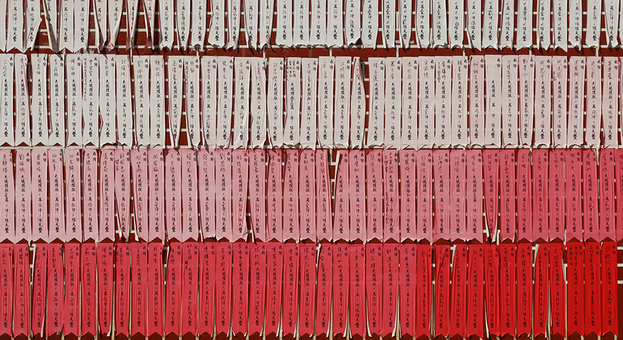 In the nieghborhood is a small temple. Debbie and I walk by some nights and the wall of it has lots of red bits of paper, showing those who donated money for its renovation. The old pieces at the top have faded to off-white and it's something I've wanted to take a snap of before the whole lot gets binned, so I veer that way home. The sun is in the right place.