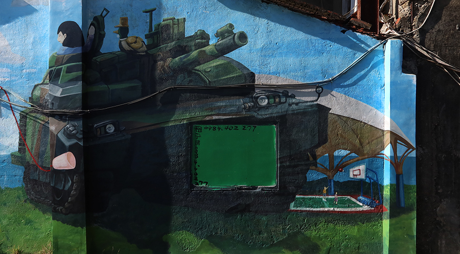 My wheels roll nicely and I wonder how long my fleece will stay on. The sun is out and colours are sharp and a few minutes from home the old homes that have some murals painted on them look tempting, so I pause and snap a few shots and take off the jacket and stuff it into my handlbar-bag to make it look like it's nine months pregnant.