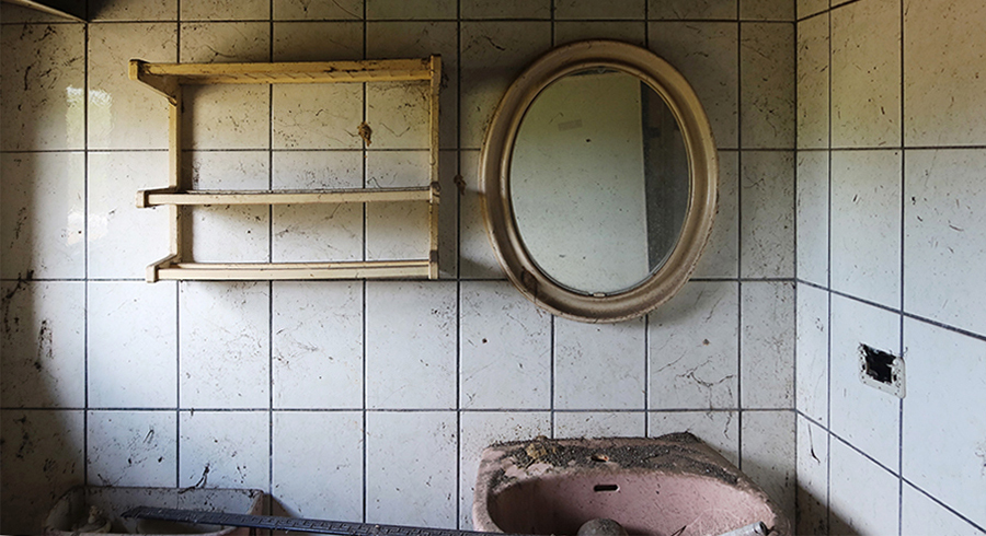 The single-floor house is still there. It's just a shell and a few wooden windows were something that I salvaged. The interior of the roofless rooms at the back have become overgrown with weeds, but there's a tent occupying one of the front rooms that looks OK. I then spot a sleeping bag inside another dry space and realise homeless people have moved in, so decide to leave after taking a couple of snaps.