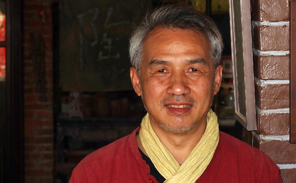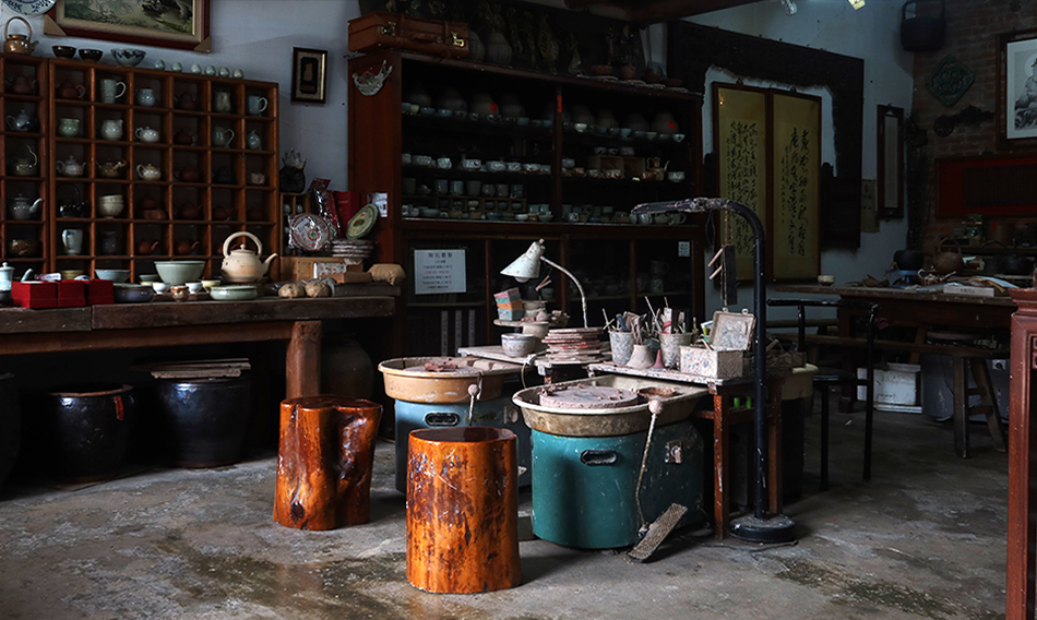 A little furthr along is a shop that I see has a coupl of potter's wheels inside. The man is selling small tea cups for between NT$150 and NT$200, while teh nice teapots are up to NT$5,000. He kindly hands me a cup of strong Pu-er tea, which isn't my favorite, and I take his portrait before making tracks.