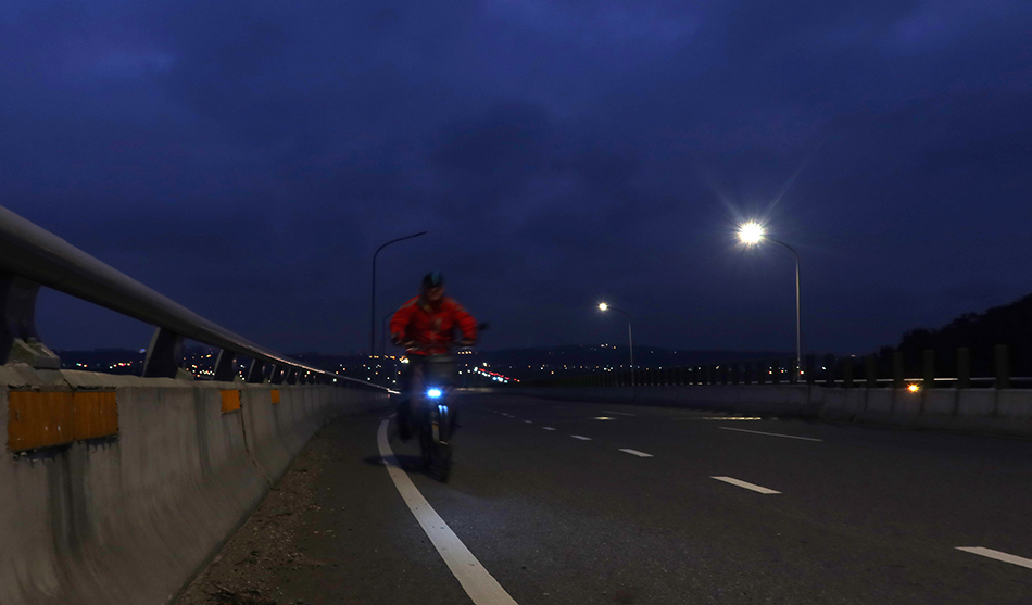 The highway lights show a climb up ahead that seems to go on forever and the wind that's been in my face all day is now taking the piss. My speed is pedestrian and my mood is one of dejection. This highway cycling is not my idea of fun, with cars zipping by. It seems wise to put my front LED on the rear rack.