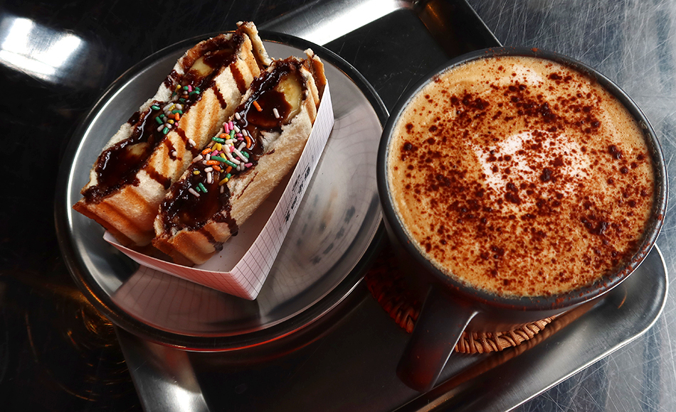 There are no customers inside the spacious, warehouse-type building and the menu has a veggie sandwich which sounds interesting, but the young woman serving says it's off, so I go for something that includes chocolate and banana.