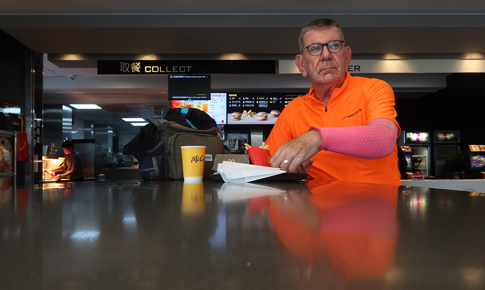 My watch also needs a new battery, but a clock says it's 12:45 when a McDonald's sign appears and I veer off the path and scoff a chicken burger. While it's OK on apple pie, it's a shame they put cinnamon on my cappuccino and it gets scraped off. I check how my progress is and it seems to be slow, but there's not much distance in today's ride, so no panic yet.