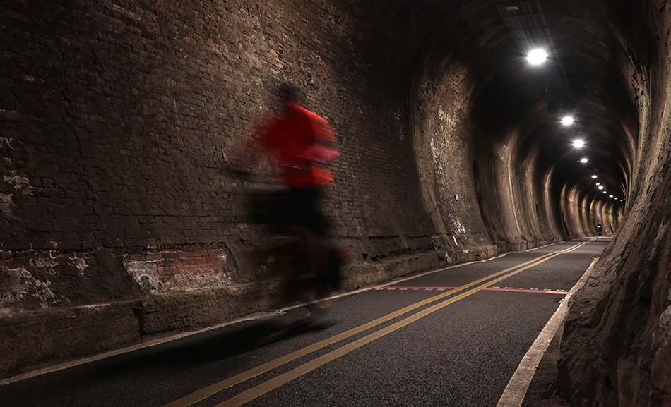 After crossing the bridge, the bike path enters a long tunnel that gently curves to the west. It's called Old Mountain Line No.9 Tunnel on Google Maps, but there is not much info' about it that I could find. My guess is it's a kilometre long and it feels a bit warmer inside and overhead lights make it OK to see. It's just that heading north means riding slightly uphill.