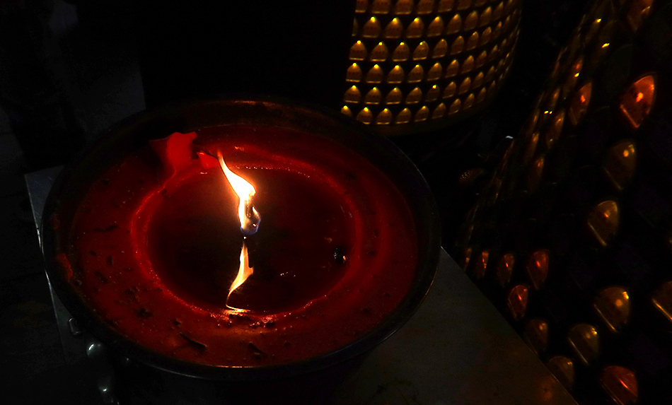 Outside, wgain we lock the bikes up and wander in to smell smoking incense. A couple of large red candles are burning away, so that visitors can light the sticks before using them to pray - then placing them in a large, brass, cauldron-like receptacle.