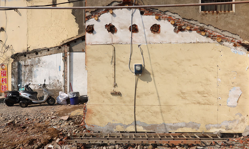 Five minutes later, once across the junction and close to an army base, the wall that had a painted mural of a tank on it has been demolished and now the interior of the old house is visible. An electricity meter is still mounted on the painted surface and I wonder what will happen to the place. A man is sat at a table inside an adjacent room that no longer has a front wall and it looks like he's selling something or other.