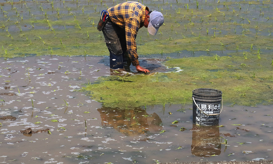 The ride back is uneventful and there's not a lot to take photos of that I haven't already. There's some countryside between areas of homes and businesses and in one field is a farmer in rubber boots is bent down, pulling slimy weed up from below the murky water and throwing it in a plastic container. It looks like he's just planted taro, with the small plants barely 6" tall. They'll be a few feet in next to no time.