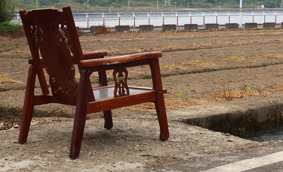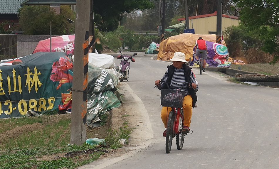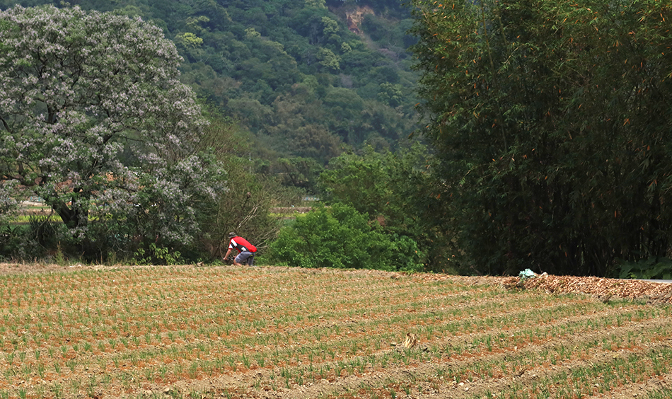 The path brings us to a bending lane and we drop towards the river at a good speed and get on a farm lane passing fields of what look like onions and it takes us to the start of a cycle path. Unfortunatelyt it's blocked off with a metal fence, with some serious-looking civil engineering work underway, but it's not a problem as another path takes us northwards and leads us to the old bridge that crosses over to the town of Daxi. We stay on this side, dip below what is now a footbridge, then the modern road one, and find the cycle path running along the bank.