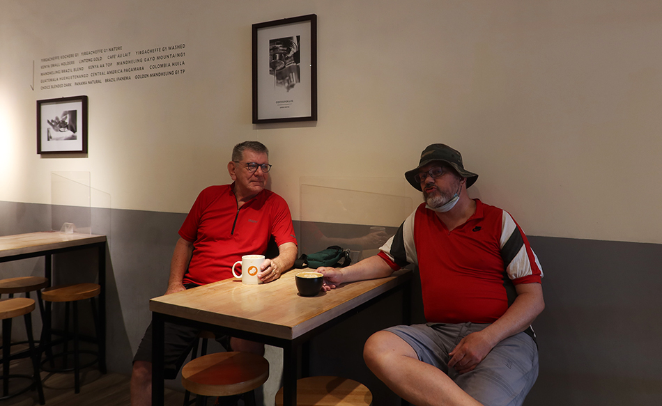 The ride is very slightly up all the way, which means I'm feeling a bit sweaty when I rest my bike outside the original Louisa Coffee. It's been about a year since I was last in this shop, but the tall, twenty-something clerk recognises me and says 'long time no see' and I order a big one and take a seat and wait twenty minutes for Ralph to arrive. I know he has to take it steady because of his leg problem and when he turns up I notice he's wearing an old Nike cycling top that I gave him.
