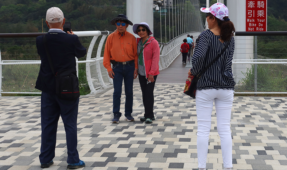 A new footbridge appears that we never knew existed. The stanchions tower high and it must have cost a fair amount, but it appears to be away from any obvious place. Nevertheless, there's a large group of people clearly here for a photo opportunity. They take turns standing in front of the imposing structure and seem to be mostly pensioners. No doubt their tour bus is parked on the other side of the river.