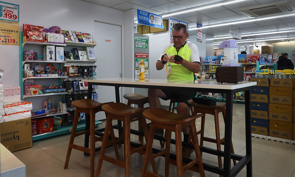 The afternoon is getting on and when the 49 inevitably connects into the main 124 in Toufen, I decide it's time to get a bite to eat and a cool drink, so pop into a 7-Eleven and buy two bananas and a bottle of green tea.
