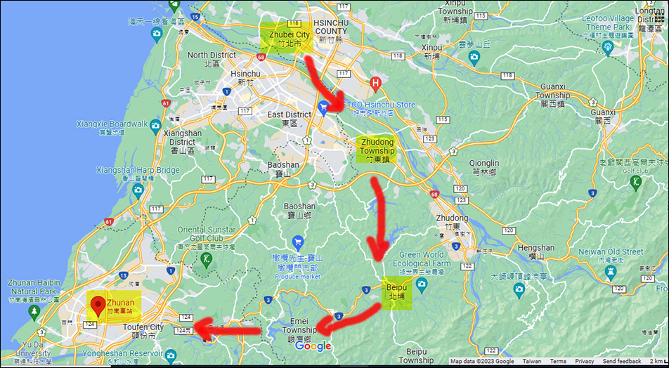 My plan is to get a train south to Zhubei and I've plotted a meandering route that wiggles southeast to the town of Beipu before going roughly west to Zhubei, where I can catch a train back north.