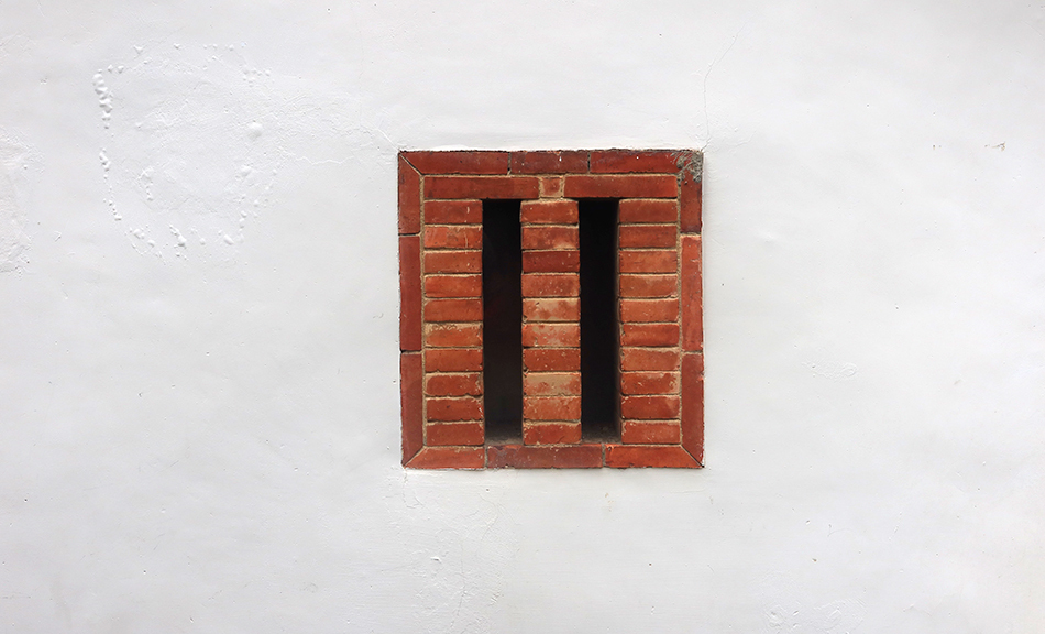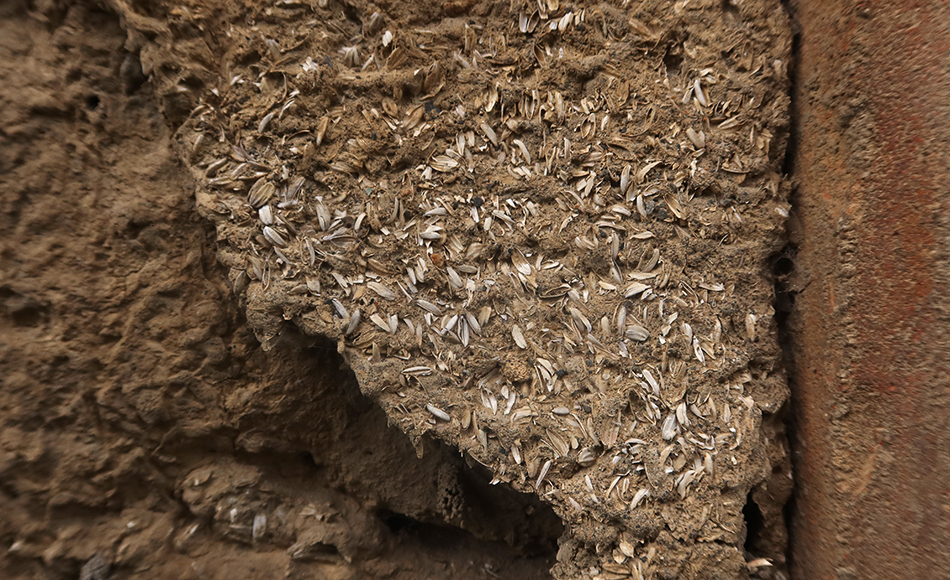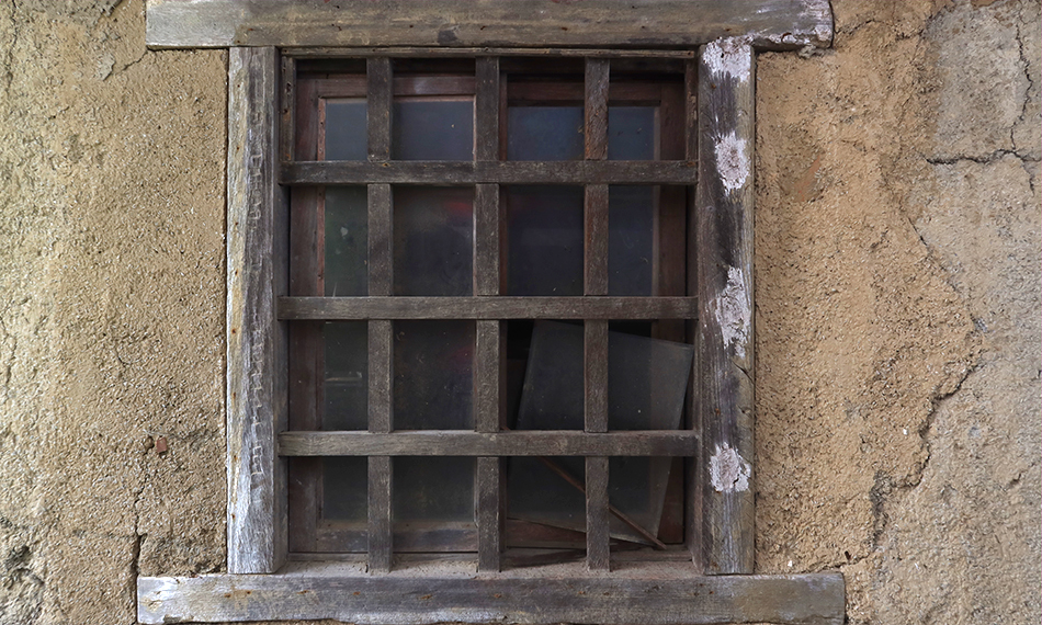 Sandwiched in between the two homes is what's left of another dwelling, with its roof having collapsed, the wooden windows long gone and mudbrick walls that have mostly disintegrated. Before getting back on my bike, I take one final snap of a piece of its wall, where rice husks are visible in the rendering, having been used as a bonding agent over a century ago.