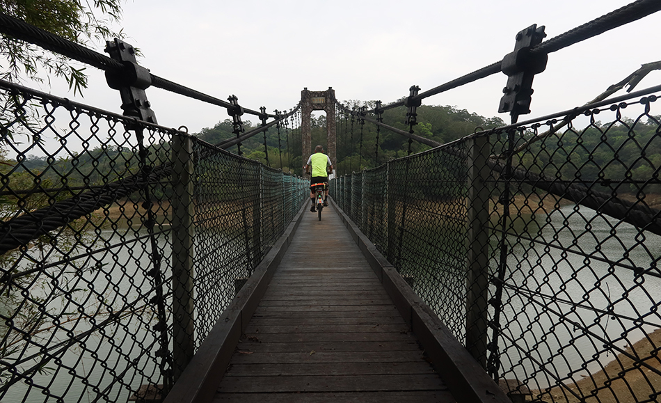 The road drops me down towards a reservoir and I get to a spot where a path leads to a suspension bridge.