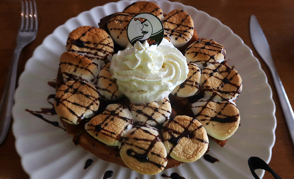 The coffee shop has an empty feel to it and the furniture is nothing special. The menu is mostly brunch items and as I don't feel like eating much, settle on a waffle. It takes over 20 minutes to arrive and it's quite a mountain of cream and chocolate. I only just manage to conquor it.