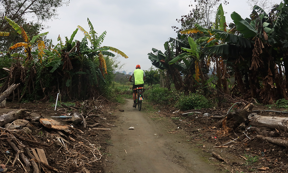 Like the concrete blocks to cross over the river, this bridge adds a bit of adventure to the day. Thankfully there's nobody else around, as the bridge is just wide enough for me on the bike and I pedal across and start cycling up a path on the opposite bank just as raindrops begin falling.