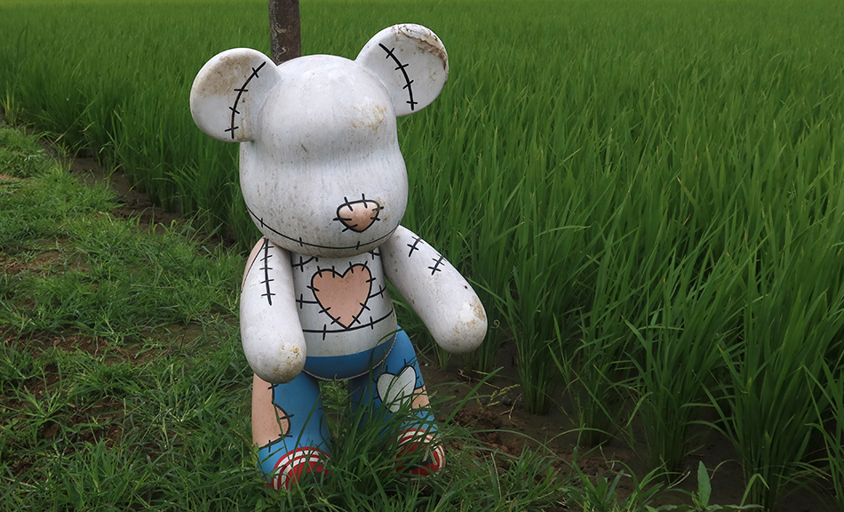 Later I play around taking a self-timed photo, but it doesn't look great and I settle of photographing a large plastic teddy that's been repurposed as a scarecrow between rice fields. Maybe it's effective; maybe not. Who knows.