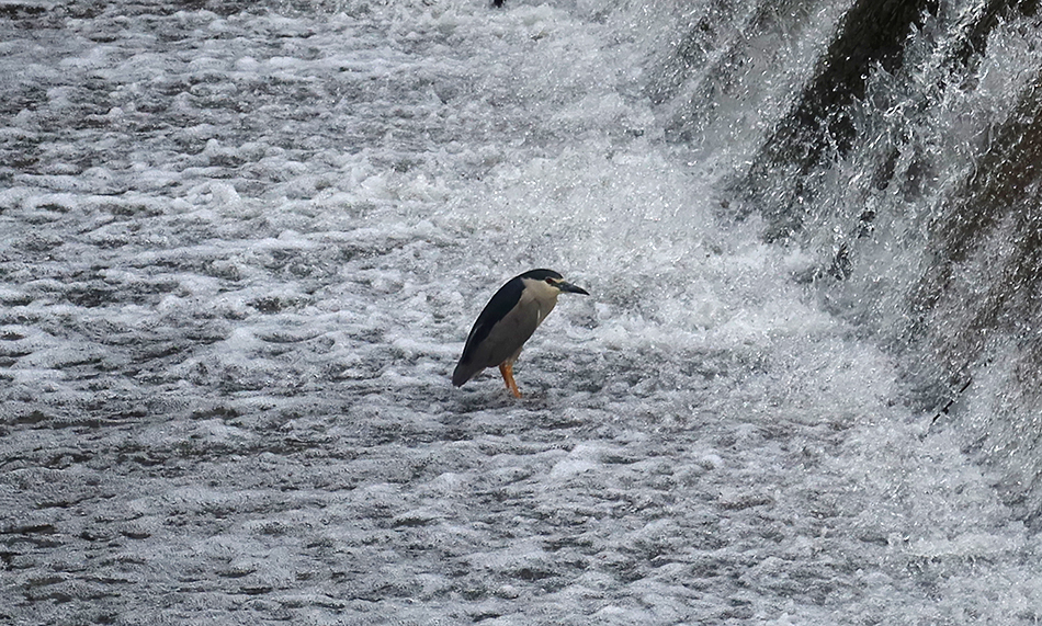 The river is quite swollen, what with the rain that's fallen recently, and I pause at a three-foot wier where one or two birds are standing like carved statues, presumably waiting for fish to drop down. The water is cascading at a decent rate and it seems like a good photo opportunity.