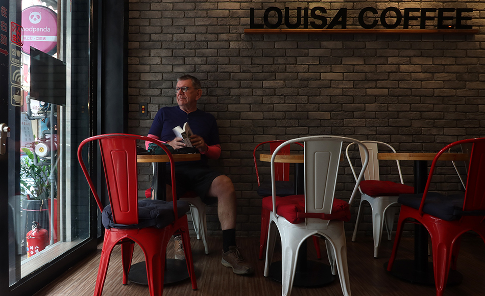 The traditional market is busy and various wayward scooters mean I ride cautiously for a couple of blocks to get to the side street harbouring Louisa Coffee. There's only me here at the moment and it feels so warm inside that it makes me wonder if they have heating on. A bagel soon hits the spot and reading the novel takes up 20-odd minutes before I decide to pop to a nearby charity shop.