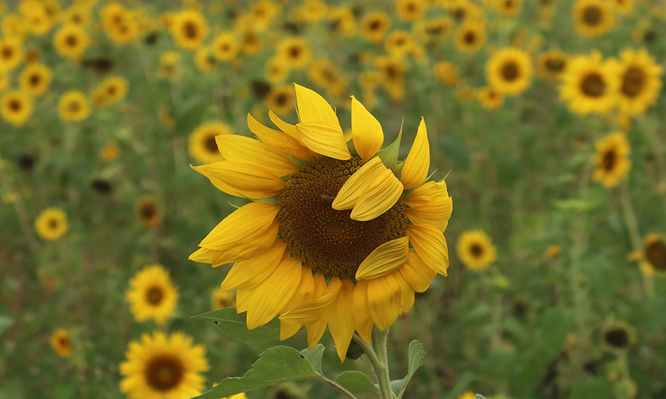 The flat lane takes me past smallholdings and paddies. A couple of fields have sunflowers growing in them and there are more rows of long polytunnels and soon there's a river flowing on my right, behind a low, concrete wall.