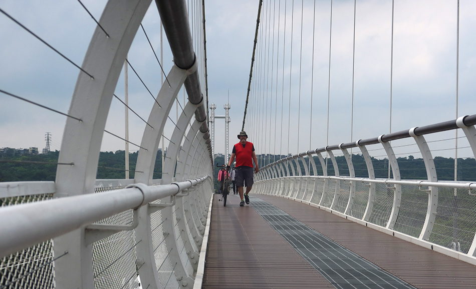 Anarchy lasts less than a minute. As we cruise over, loudspeaks give instructions in Chinese which we don't understand, but guess the message is telling us to get off and walk. A uniformed security guy approaches from the far end and sure enough asks us to do just that. It's a long bridge.
