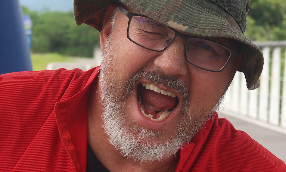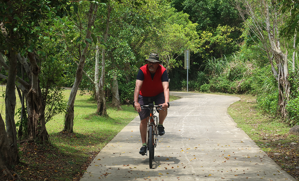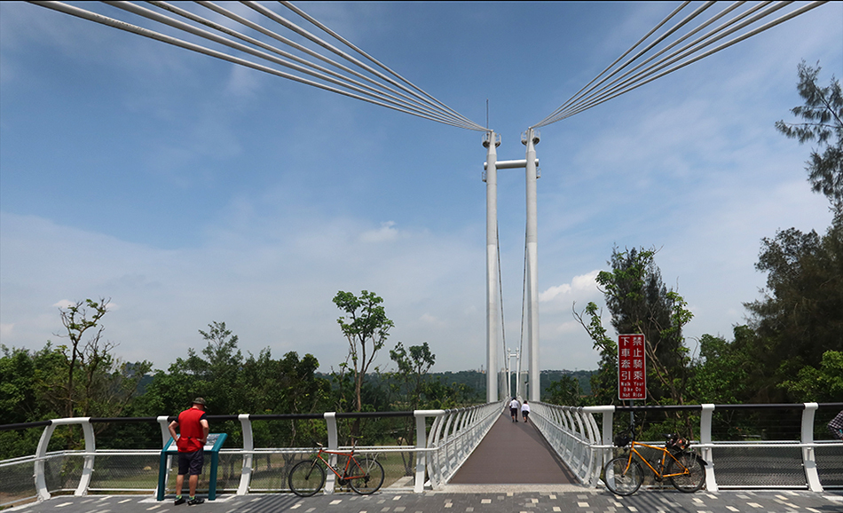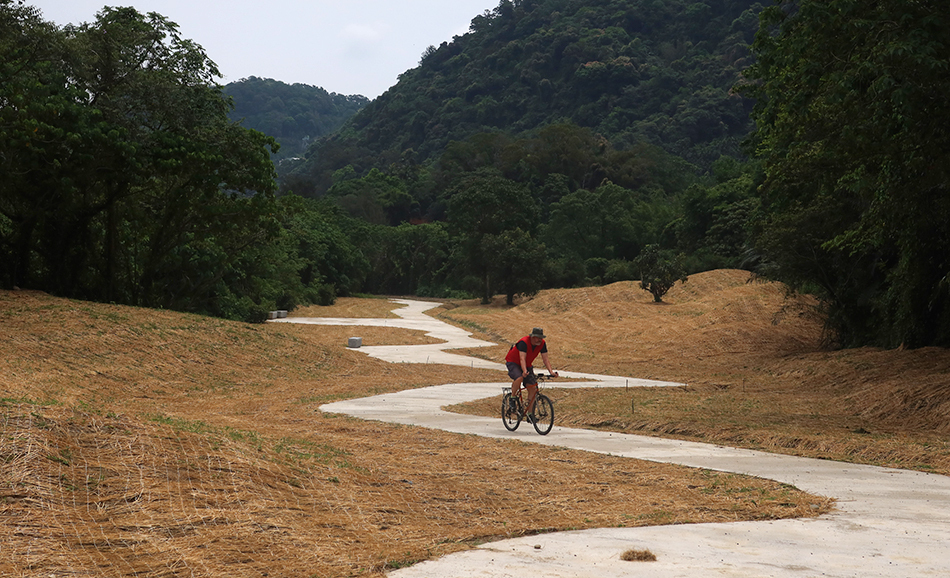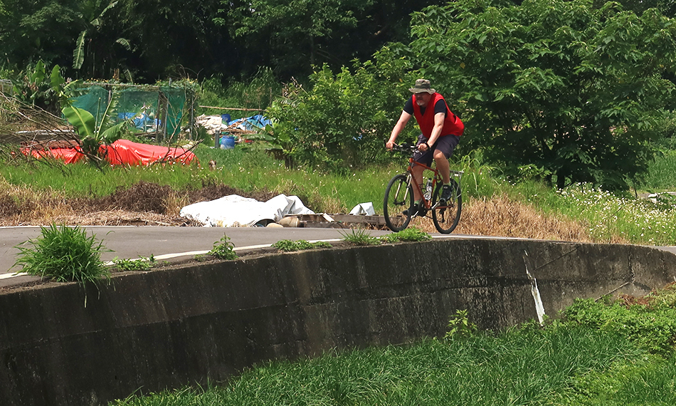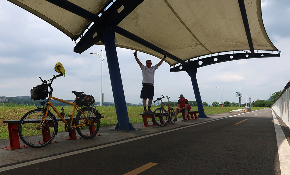 It's only about a 20-minute drive to Daxi and Ralph parks in a lot on the edge of town and we soon set off and ride beside a wide river that flows north to Taipei. Just as we're about to veer towards the main road, we see a new-ish information map and the start of a road that's recently been built. The high stanchions of the new bridge that we saw about a month or so ago are visible - the structure is only about 500 metres away - and temptation and curiosity get the better of us.