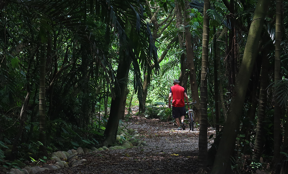We start to wonder if the path will actually go as far so as to connect to the riverside road that goes to Yingge, but it doesn't. It eventually bends slowly and rises slightly before coming to a tree-shaded gravel section, making us get off to wheel the bikes - unsure where we're going. After a few minutes there steps that drop down to a large, steel gate.