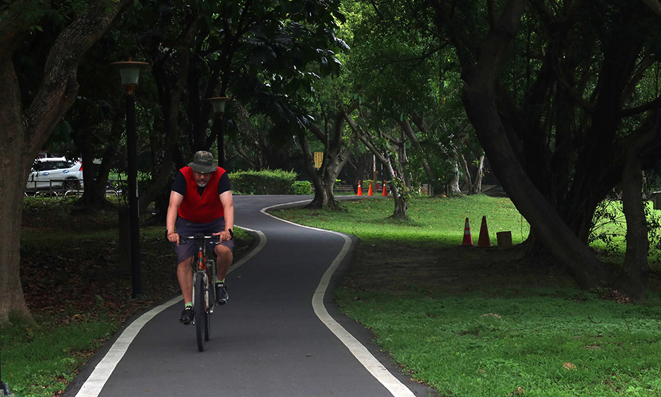 Rather than cycling to Happy Happy Valley, which will involve some long hills, we decide to obey the red signs and walk our bikes over the long footbridge, then cycle along a winding path through countryside towards the pottery town of Yingge. There's a Starbucks there, which Ralph and I went to last time.