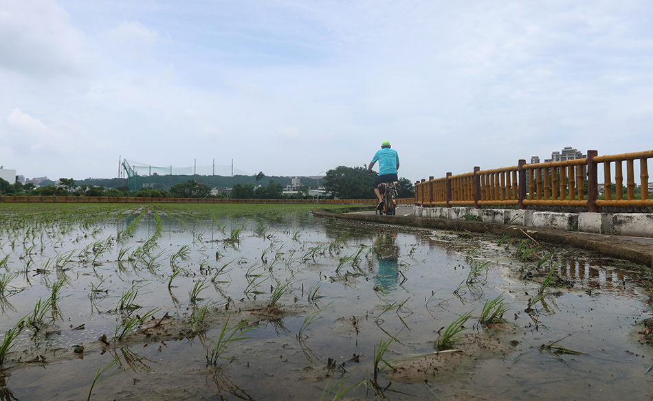 The bicycle path starts as wooden boards and goes to poured concrete, then block paving before eventually getting to a series of lanes. During all this, the it leaves the town, where houses back onto to the route. These are mostly shabby-looking places, but they're worth a ton due to their prime location. Rice fields soon appear and the new shoots have recently been planted. The lane finally veers through a neighborhood likely built in the 1990s. It's all quite nondescript and photo opportunities are scarce.