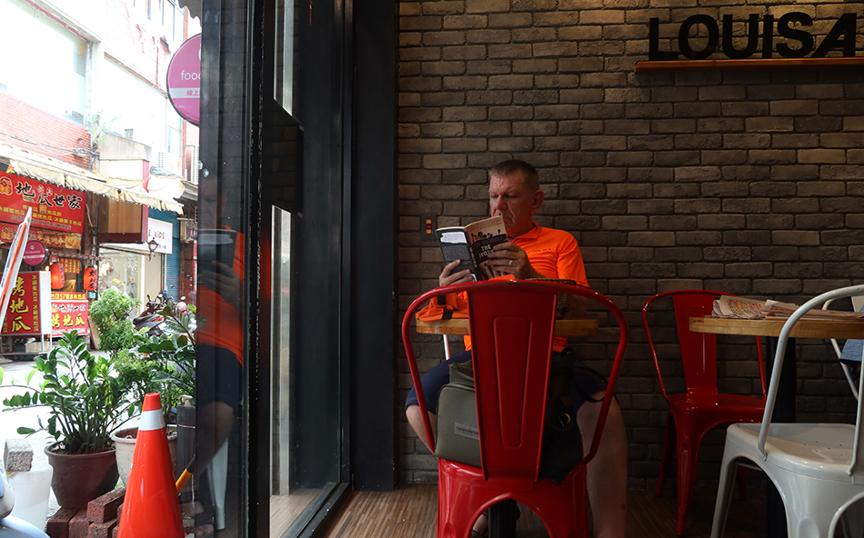 Once in Danan, I make my way through its traditional market and pop into the charity shop and find a new, turquoise XL shirt made of cotton with a label that includes the word Italy, but which no doubt was made in China. It's only NT$50 - less than US$2 - so I buy it and cruise around the corner to Louisa Coffee. It's gone 12:30 and I order a toasted tuna sandwich. I've brought along a novel and that gets read for 20 minutes or so.
