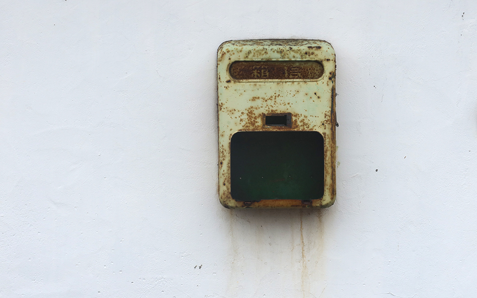 A minute after turning left off the 114, there are five wooden stools stacked outside a building that looks like it's a place people eat in, but i culd be wrong. At least I'd like to think so. A small dog tied to a post barks at me when I stop to take a snap of them, so I opt to keep going and descend down a lane and find myself heading into countryside. An old house that looks empty deserves a closer look and once in its front yard I notice a nice metal mailbox and take a snap of it.